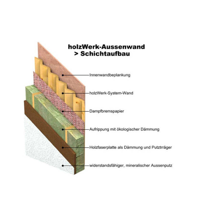 Der Wandaufbau unserer Fertighäuser aus Holz beruht auf einem mehrschichtigen, mehrfach erprobten und kontinuierlich optimierten System. Hier könnt Ihr als Beispiel den Wandaufbau für eine holzwerk®-Außenwand mit Putzträger sehen. Alternativ können wir auch eine äußere Holzfassade anbieten.