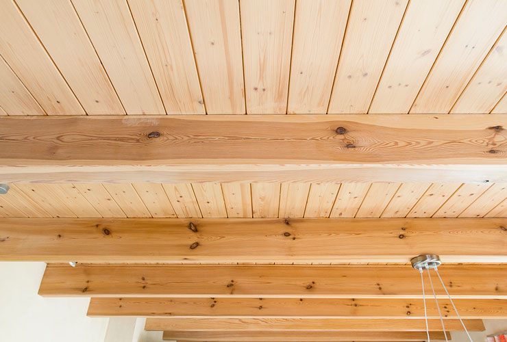 Hier mit sichtbarer Holzdecke